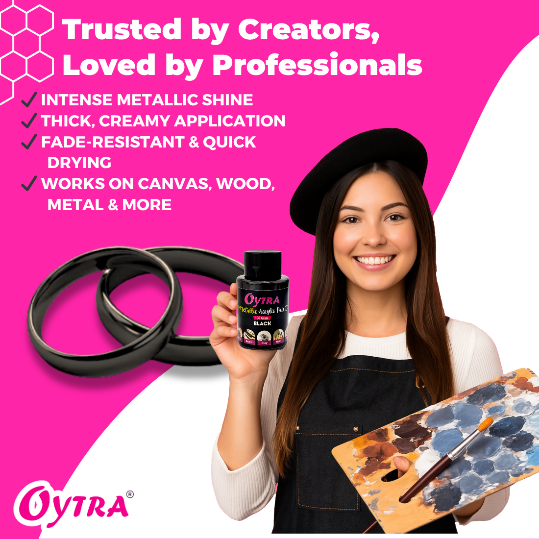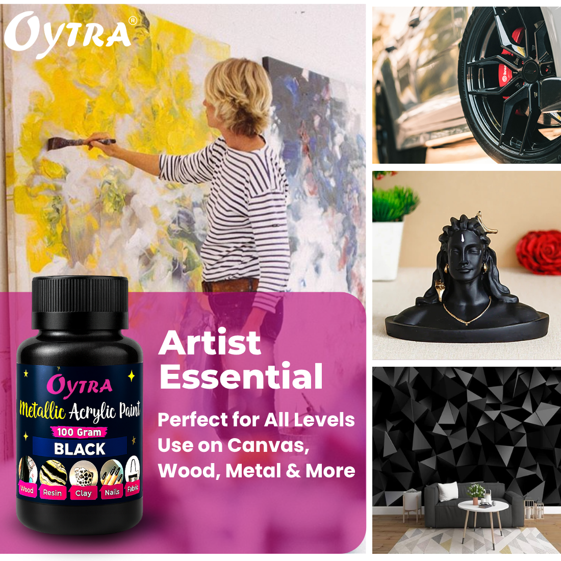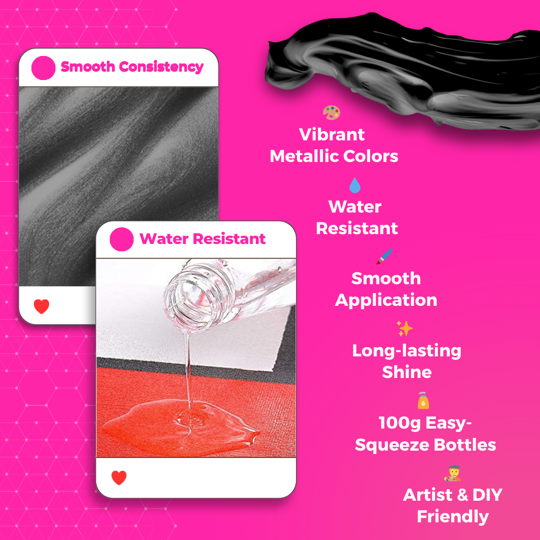 - Convenient 100grams Bottles - Each Acrylic Metallic Paints Set Contains Generous 100 Grams Bottles of Black Colour Metallic Acrylic Paint, Providing Ample Supply for Your Artistic Endeavors. The Easy-to-squeeze Bottles Ensure Mess-free Dispensing, While the Secure Caps Prevent Drying Out Between Uses.