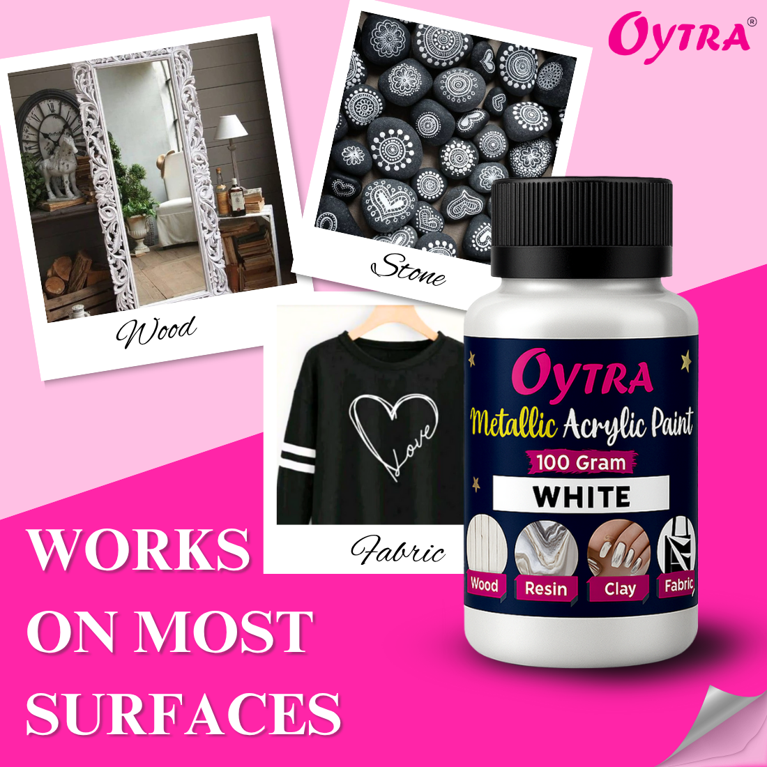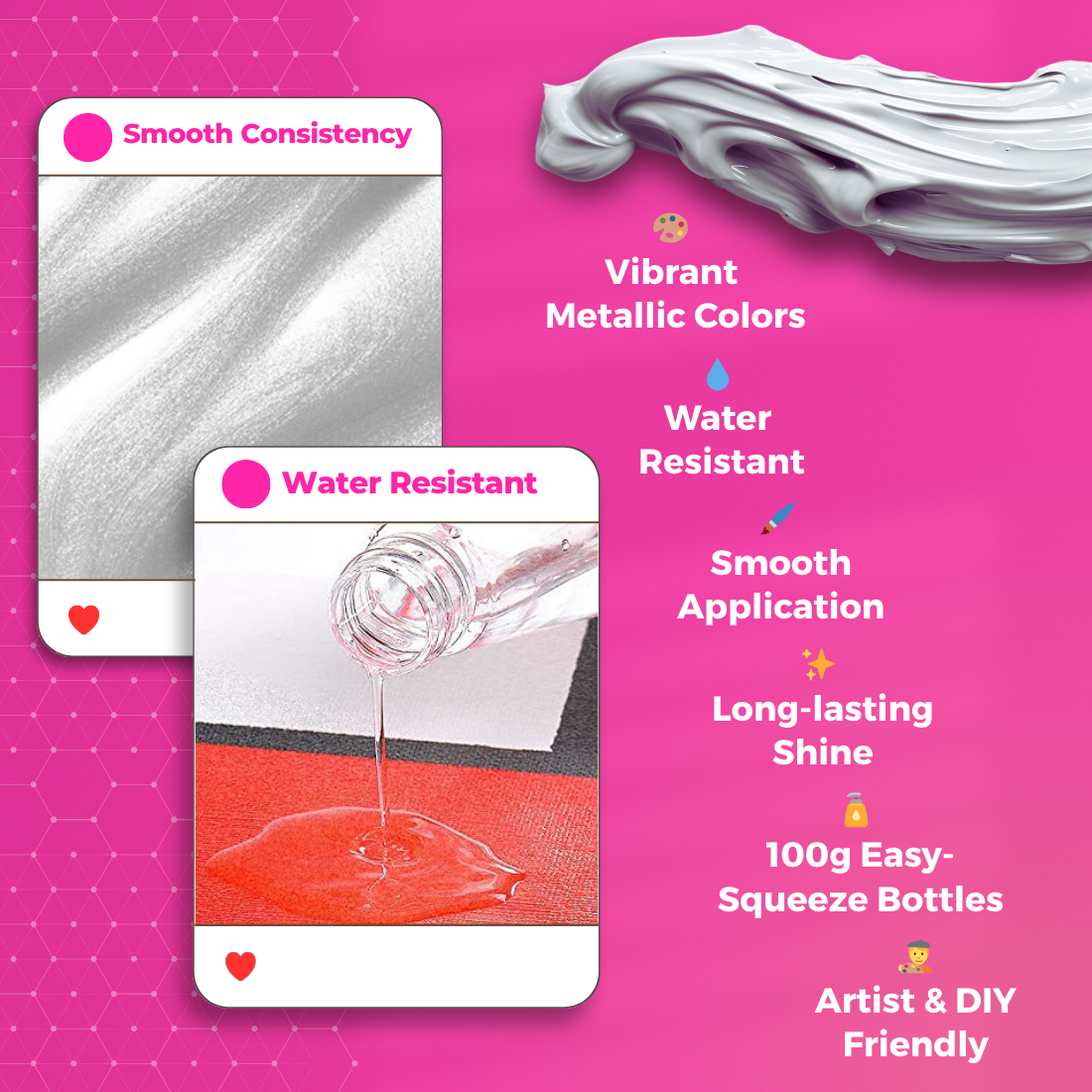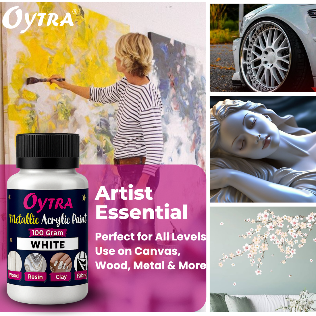 - Convenient 100grams Bottles - Each Acrylic Metallic Paints Set Contains Generous 100 Grams Bottles of White Colour Metallic Acrylic Paint, Providing Ample Supply for Your Artistic Endeavors. The Easy-to-squeeze Bottles Ensure Mess-free Dispensing, While the Secure Caps Prevent Drying Out Between Uses.