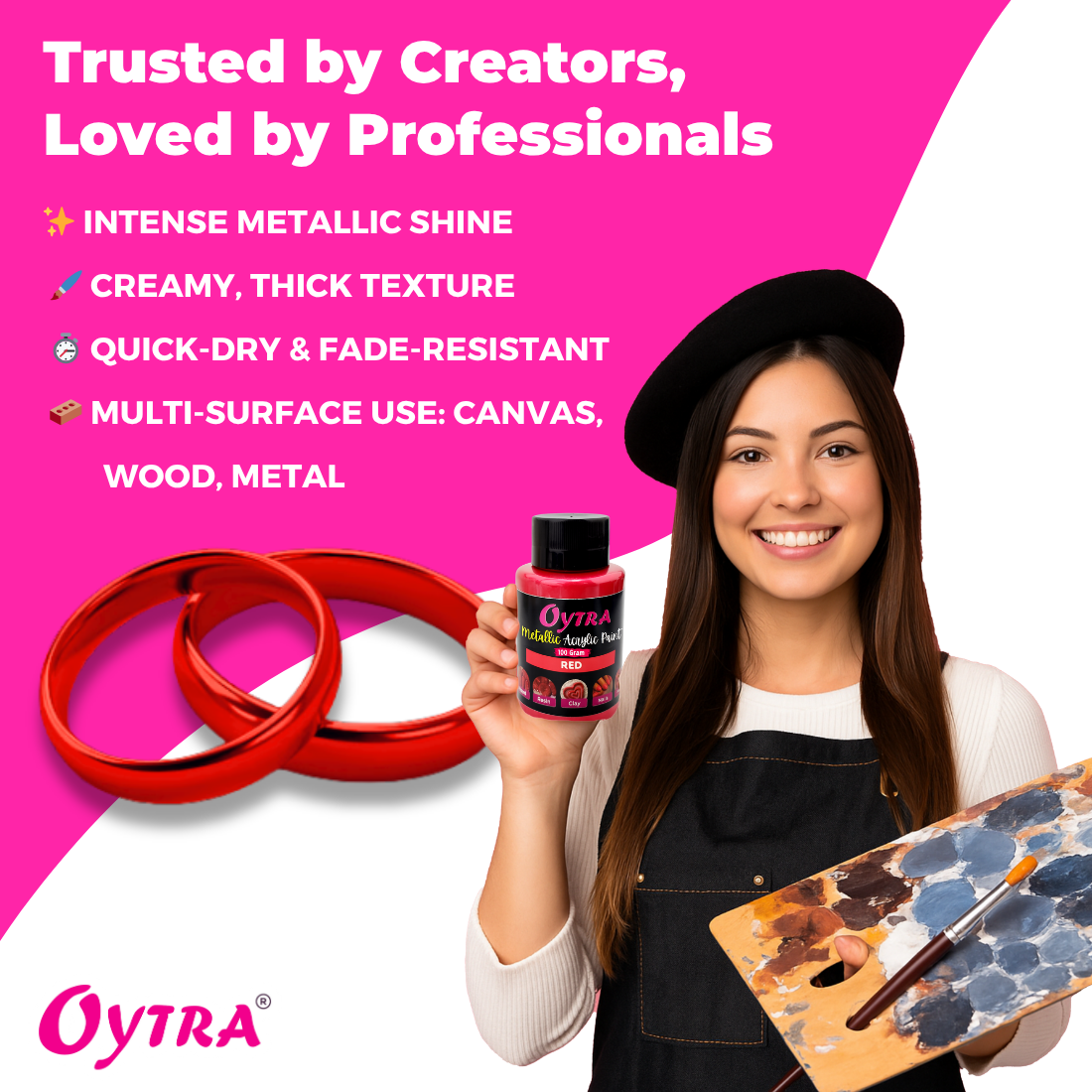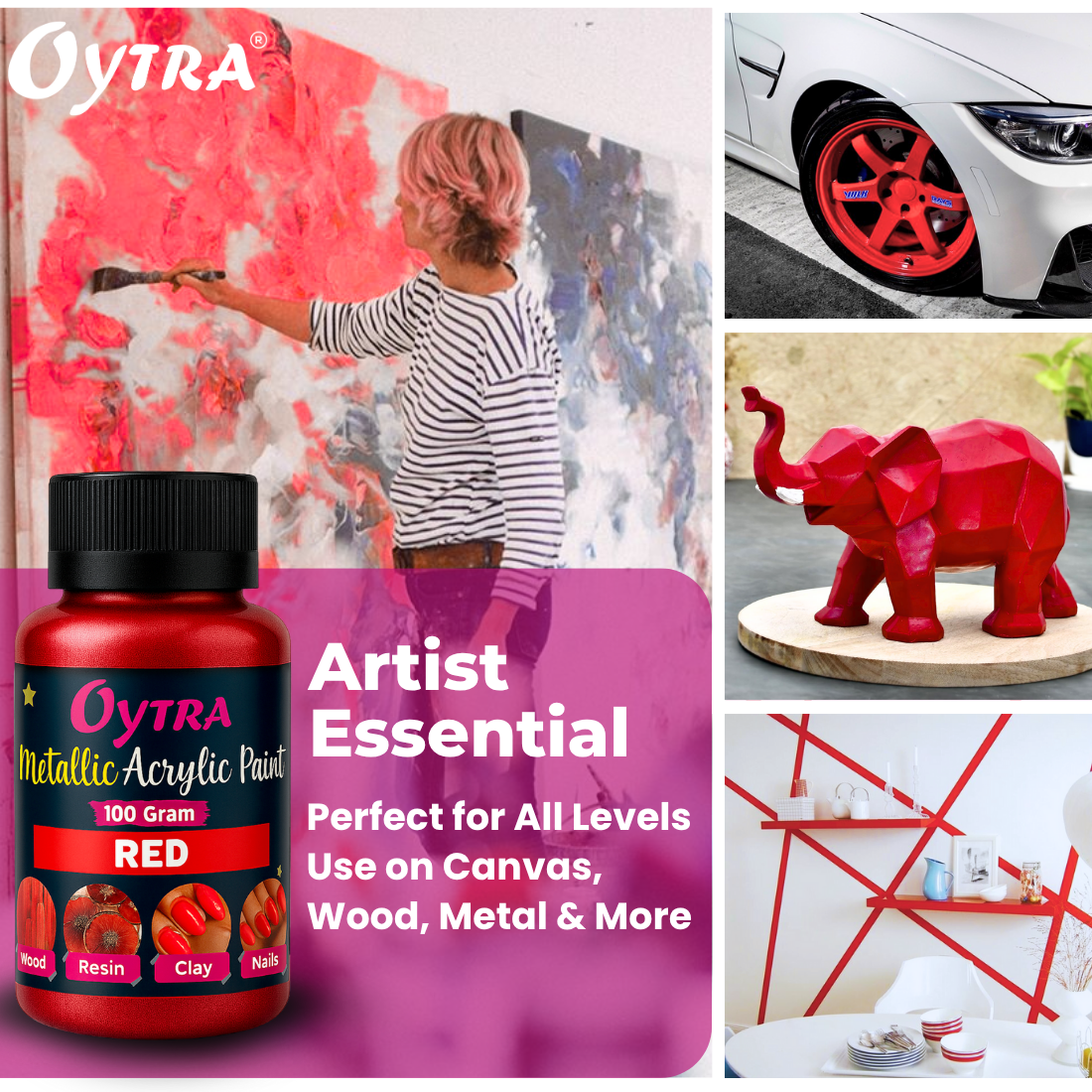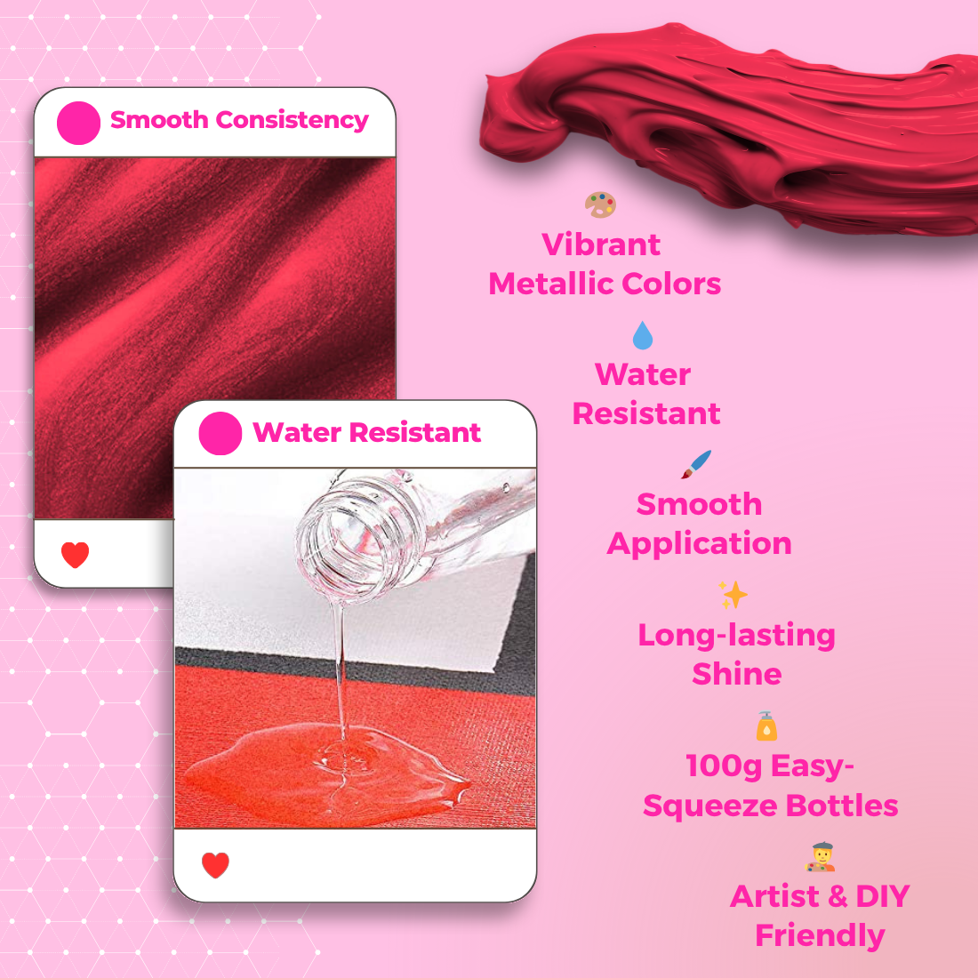 - Convenient 100grams Bottles - Each Acrylic Metallic Paints Set Contains Generous 100 Grams Bottles of Red Colour Metallic Acrylic Paint, Providing Ample Supply for Your Artistic Endeavors. The Easy-to-squeeze Bottles Ensure Mess-free Dispensing, While the Secure Caps Prevent Drying Out Between Uses.