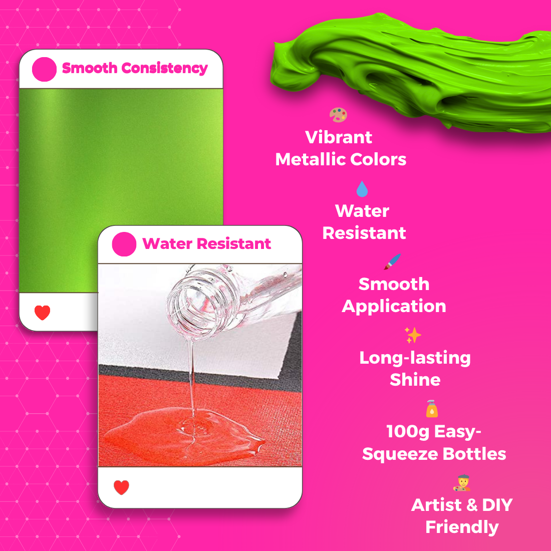 - Convenient 100grams Bottles - Each Acrylic Metallic Paints Set Contains Generous 100 Grams Bottles of Parrot Green Colour Metallic Acrylic Paint, Providing Ample Supply for Your Artistic Endeavors. The Easy-to-squeeze Bottles Ensure Mess-free Dispensing, While the Secure Caps Prevent Drying Out Between Uses.