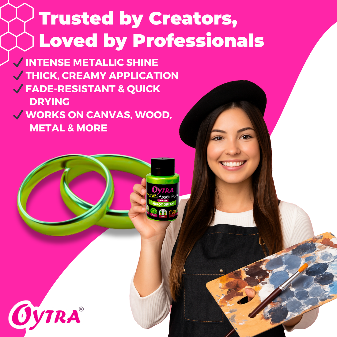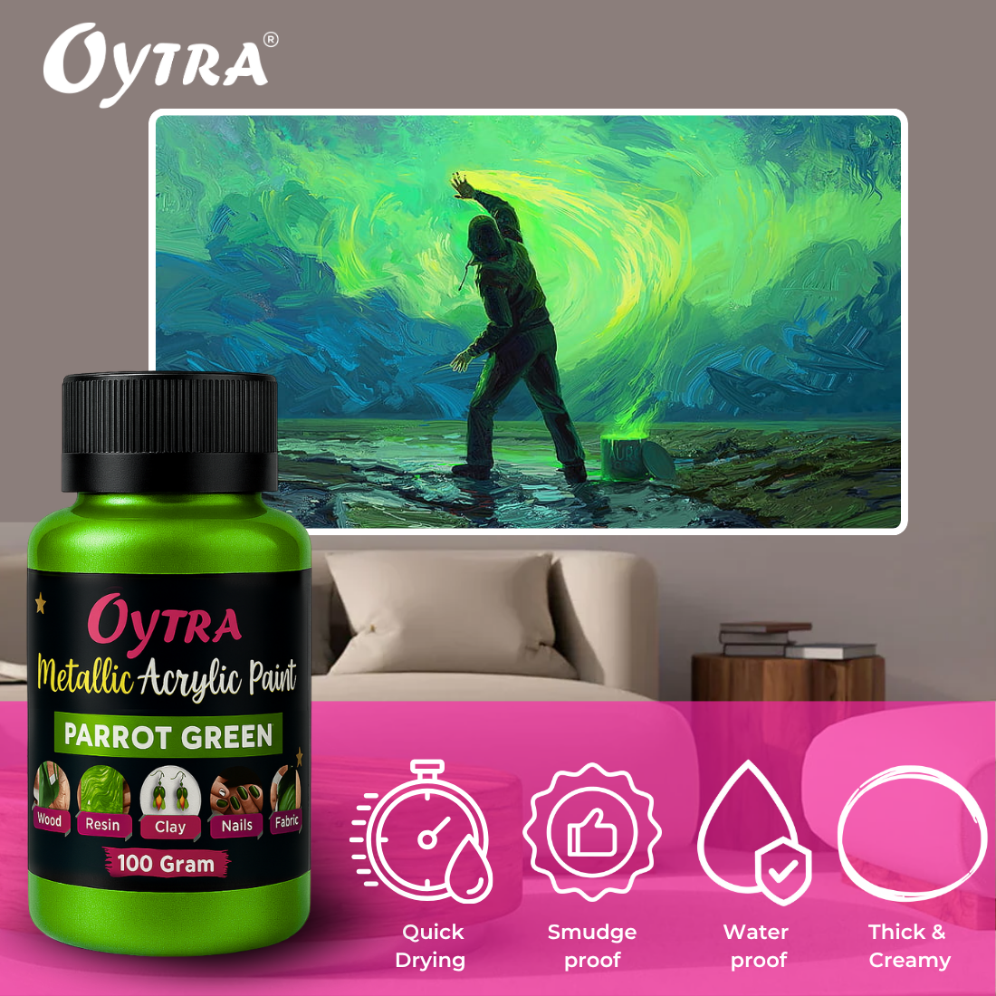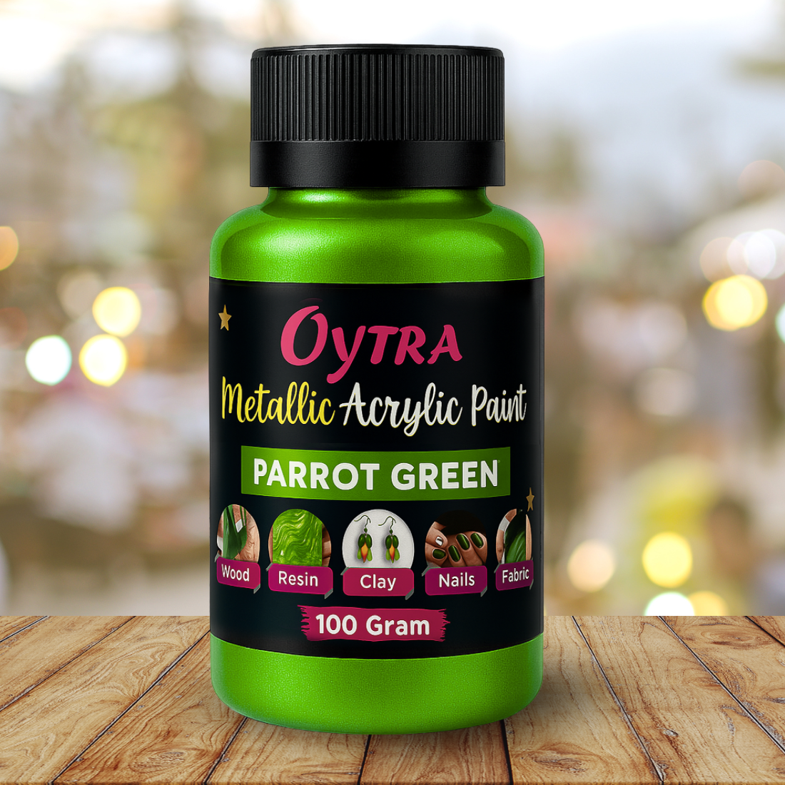 - Vibrant Metallic Parrot Green Acrylic Paint 100g - Our Parrot Green Paint For Metal Is Designed To Give A Brilliant Shine And Smooth Texture. Each Acrylic Metallic Paint For Metal 100 Gram Bottle Delivers Long-Lasting Coverage Making It Perfect Metallic Paint For Metal Or Wooden Furniture Painting.