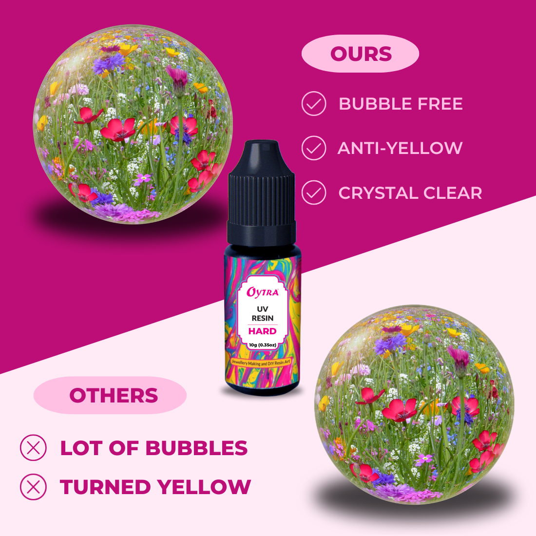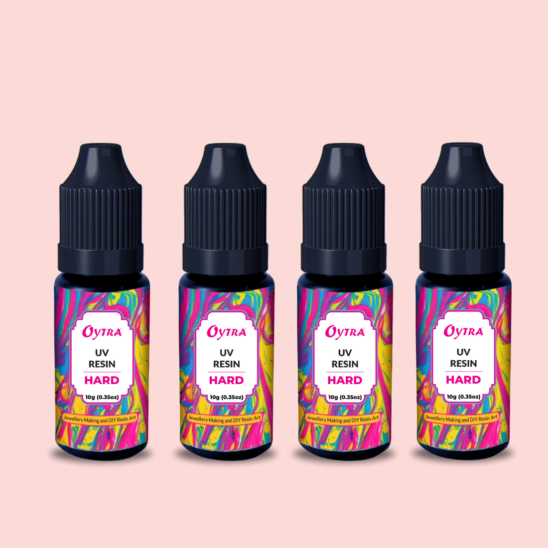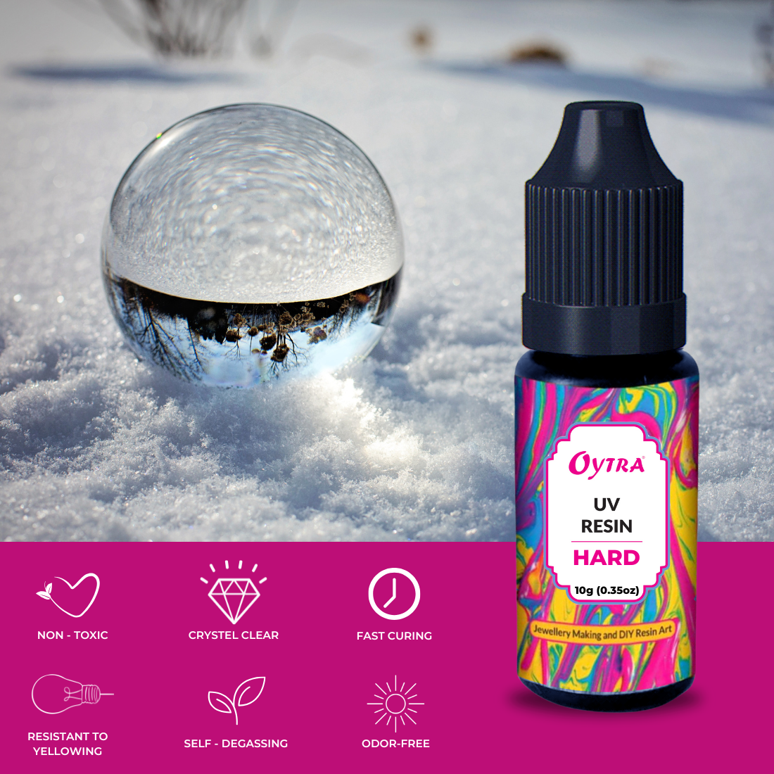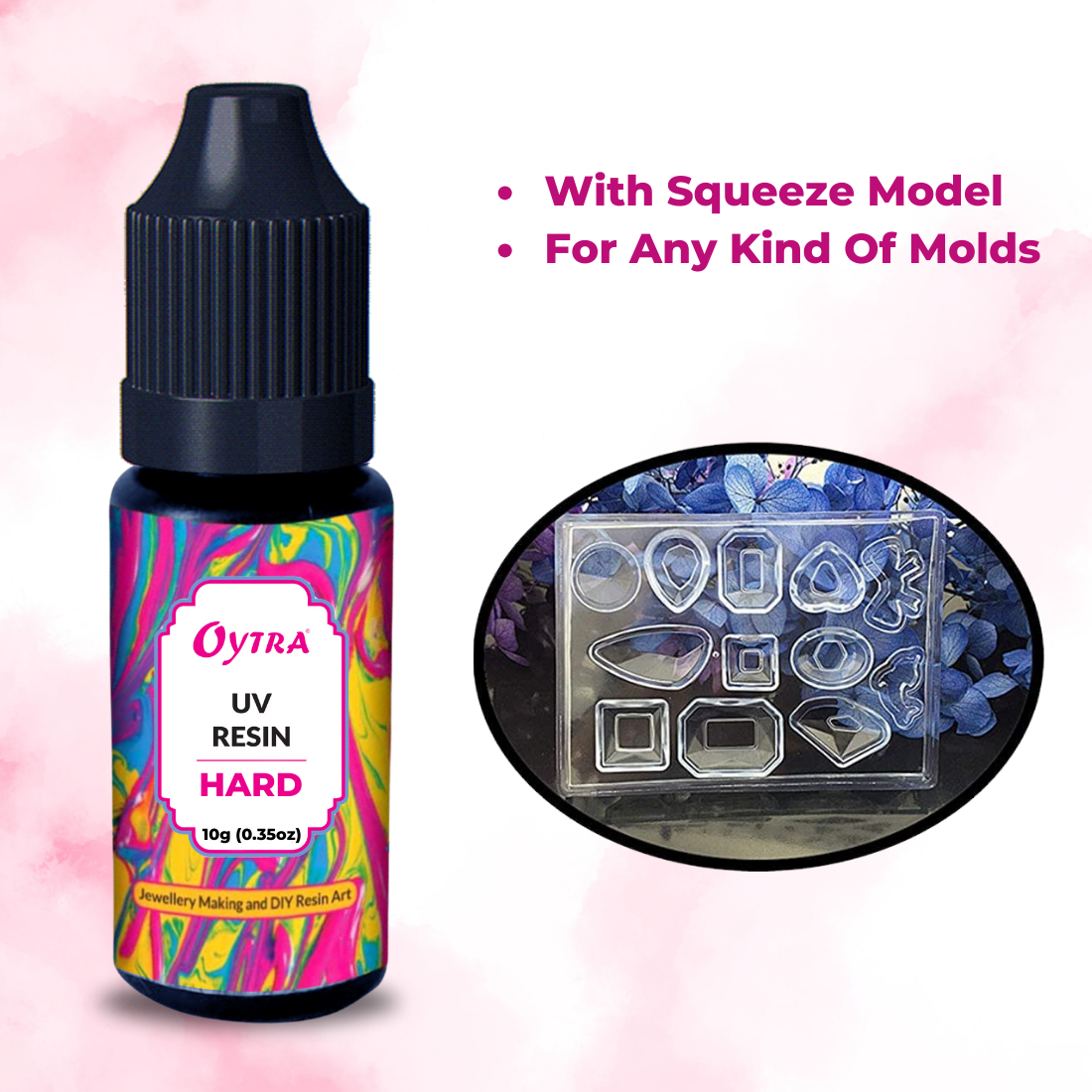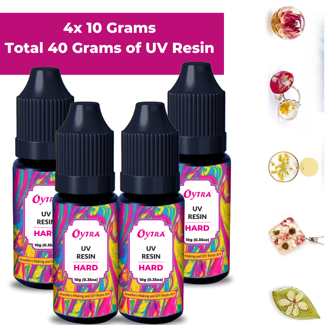 UV Curing Resin: 4 bottles of 10g each 1) A Quality UV Curing Resin 2) Manufactured Locally in India 3) Non-Toxic 4) Curing Time - 5-10 Minutes 5) Use Any UV Light Lamp for Curing 6) Result - Ultra Clear Glossy Ideal for Use with Oytra Polymer clay