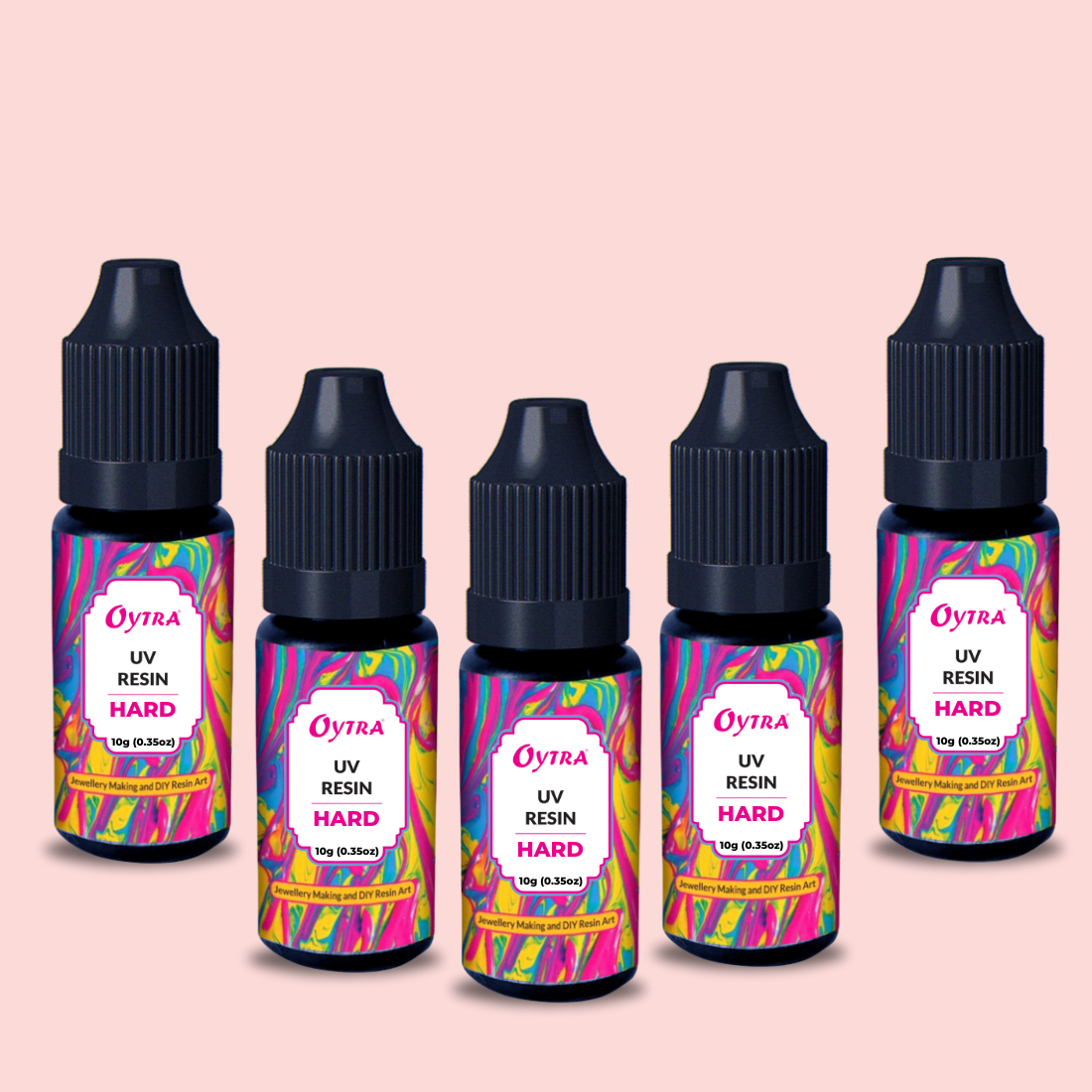 UV Curing Resin: 5 bottles of 10g each 1) A Quality UV Curing Resin 2) Manufactured Locally in India 3) Non-Toxic 4) Curing Time - 5-10 Minutes 5) Use Any UV Light Lamp for Curing 6) Result - Ultra Clear Glossy Ideal for Use with Oytra Polymer clay