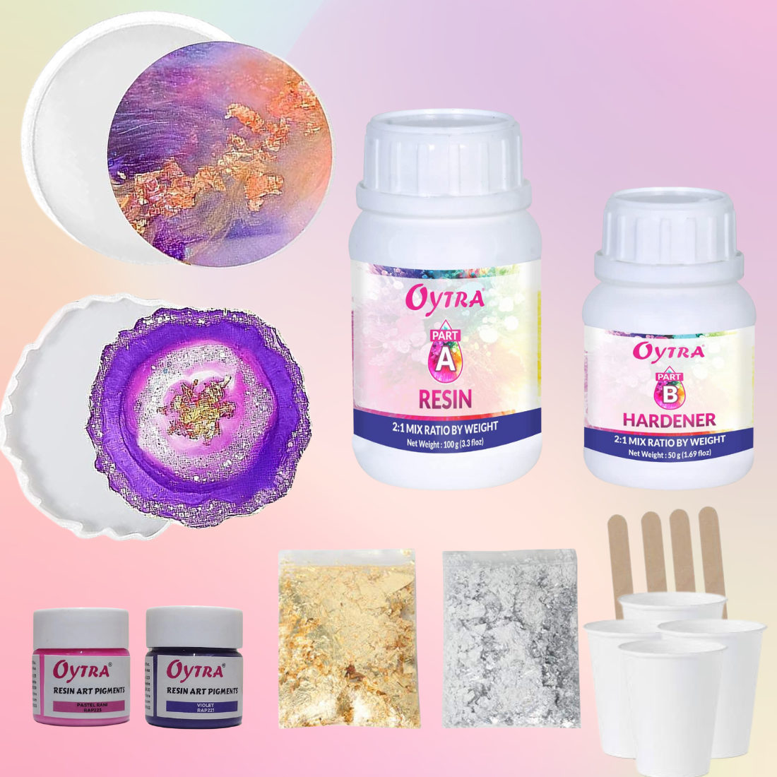- Experience the Ultimate Epoxy Resin Art for Coaster Making Kit Journey with Our Complete DIY Kit, Featuring Coaster Resin Mould, 150 Grams Art Resin and Hardener, Resin Pigments Colour Set, Mixing Cups and Wooden Sticks, Gloves, Gold and Silver Flakes Craft Kit.
