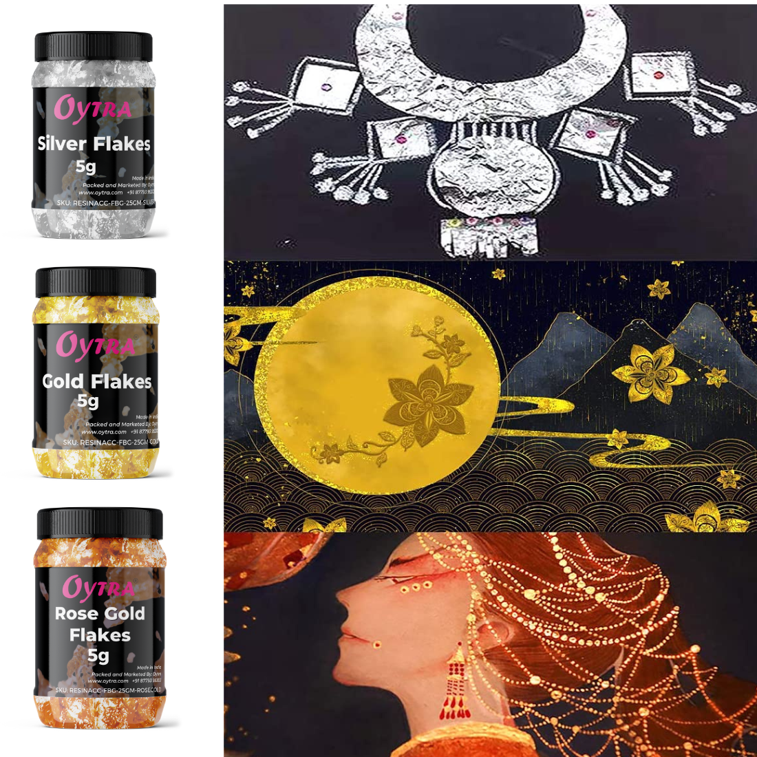 Oytra Gilding Flakes Silver and Gold Metallic Leaf Foil Paper Flakes Set of 3 Color Bottles DIY Art Craft Materials for Resin Nail Art Cake Decoration Painting Soap Making Supplies for Beginners Artists