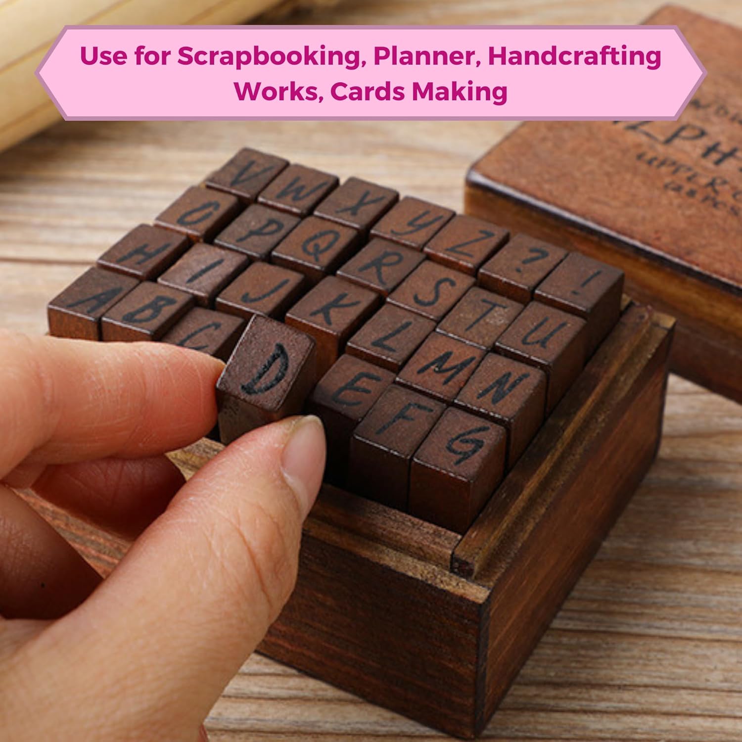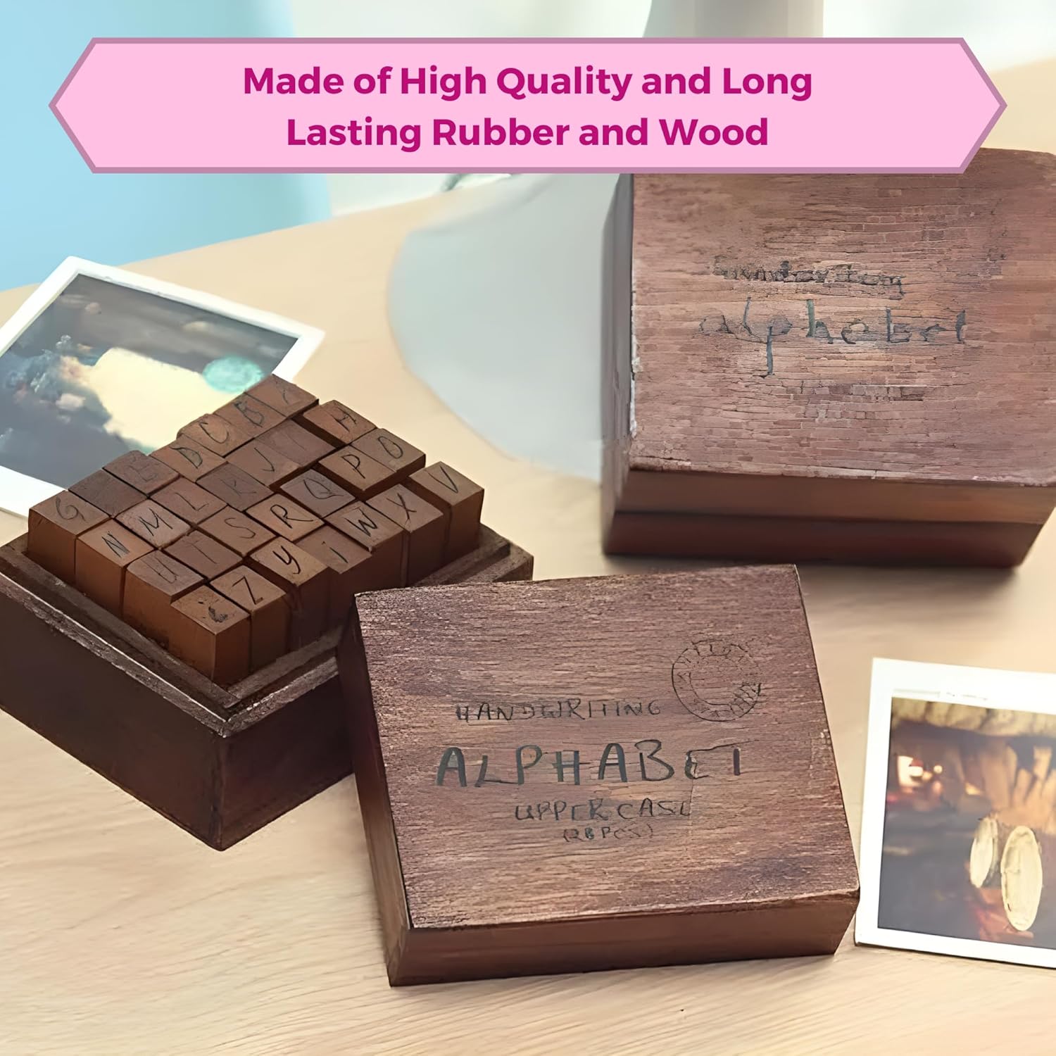 28 Pieces Capital Alphabet Wooden Rubber Stamp Set with Vintage Storage Box for DIY Crafting, Scrapbooking, and Card Making